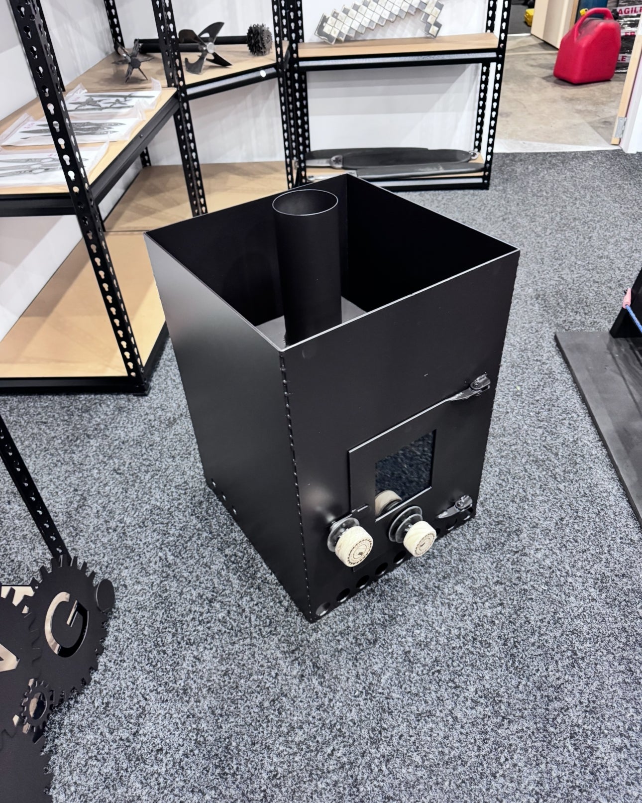 fire box dimensions: 350mm high x 350mm deep x 250mm wide. The firebox also floats 50mm above the bottom of the outer stone box, allowing heat to come from the bottom rather then being lost into the floor, and traveling up through the stones and out of the front of the fireplace minimizing heat loss and maximizing efficiency