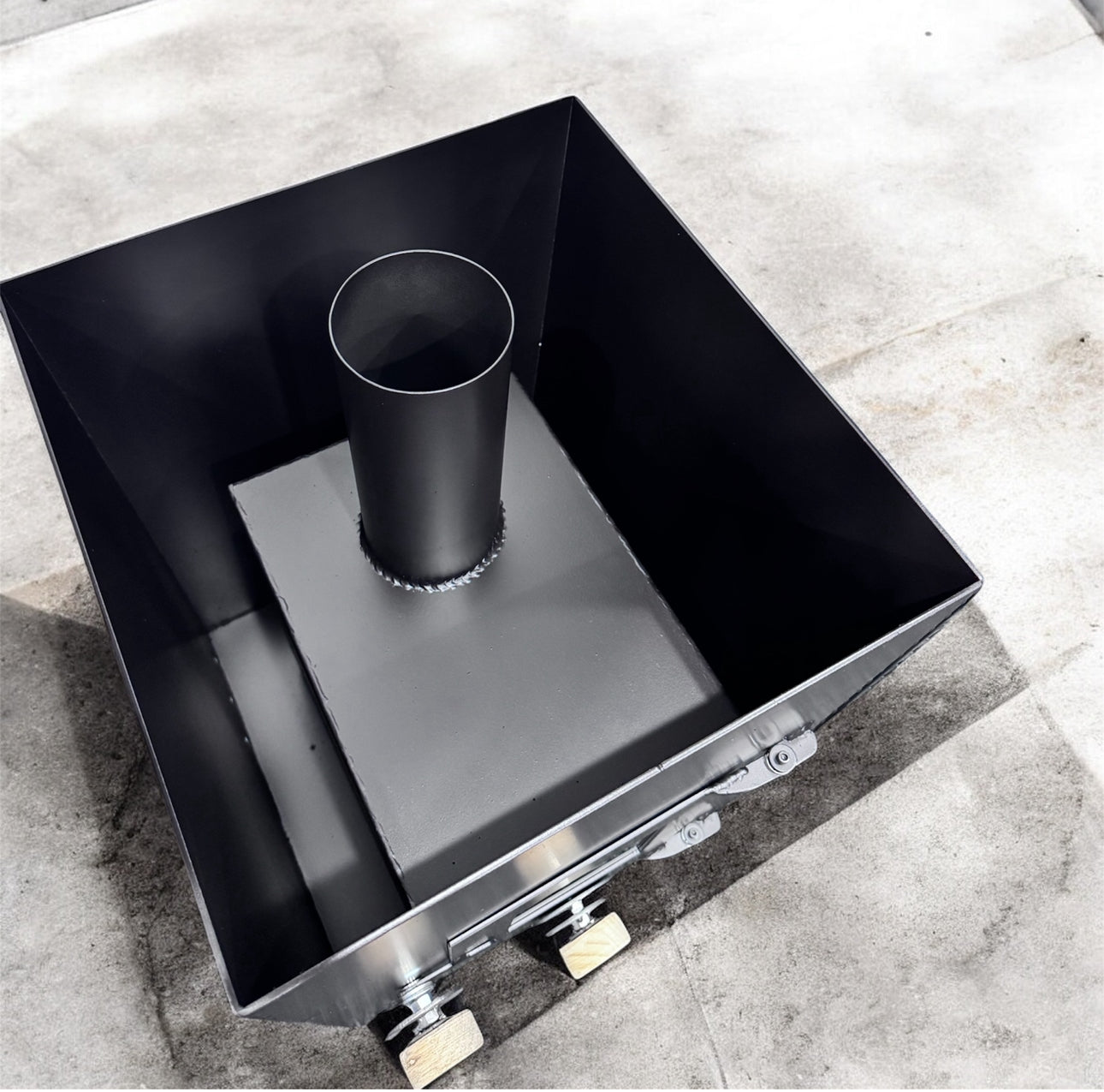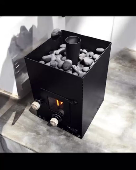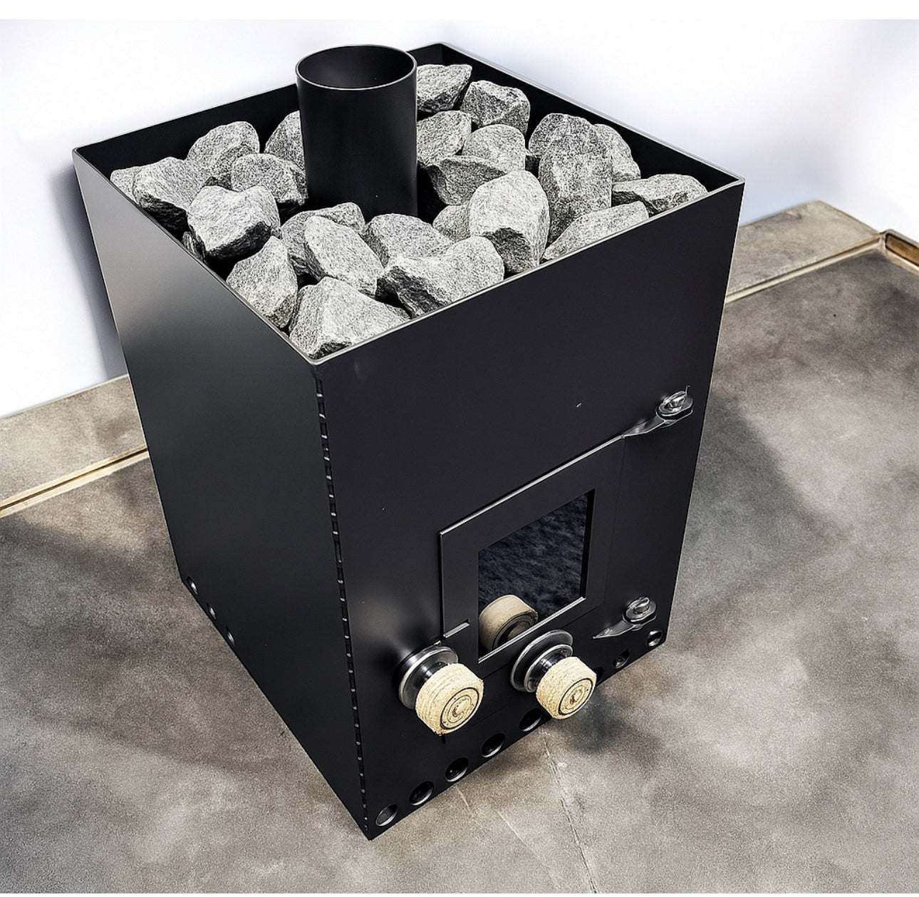 stone capacity: fully encased in stones: volume around 35 liters so 80-100 kg of sauna stones, 80mm gaps down the sides and back of the firebox, then fully covering the top & around the flue 200mm above the fire box to the top of the sides, and can be piled up further above the total height around the flue if you want maximum stones, in this case it may take more then 100kgs depending on the type and size of stones you are using.